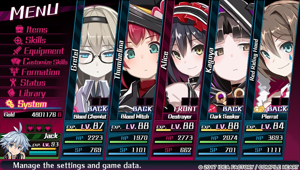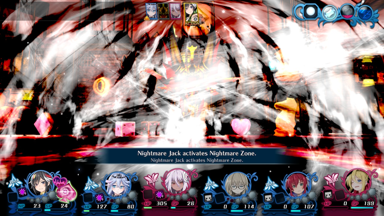 One thing I really like about Mary Skelter 2 is its pacing. All the mechanics are revealed slowly - this is great for such a complicated game, and many RPGs do it wrong. Imagine if right away you were required to do Blood Farming, flee from Nightmares, avoid well-placed traps, painstakingly choose your equipment and watch heplessly as Ripper Jack rips and tears through your team. But every time something new is introduced, you have an opportunity to learn it - and the two first dungeons are pretty much tutorials. Though, what I ended up disliking in the end is that the Nightmares appear way too rarely, and even when they do, they're not very dangerous (aside from the one in the last dungeon).