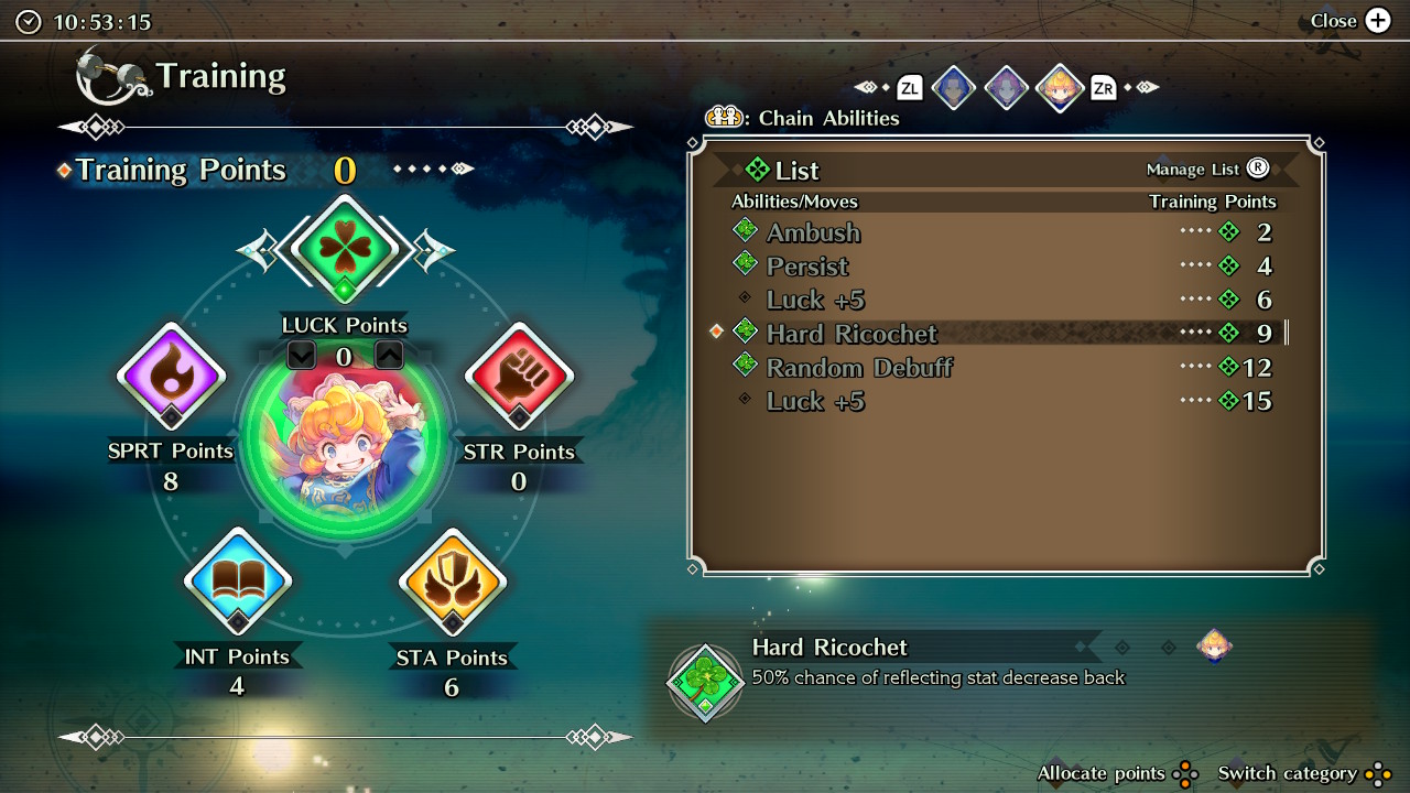 I haven't yet mentioned the very good skill and class system in this game because it's almost completely wasted. Why bother painstakingly designing your party when you can button mash through the vast majority of enemies, anyway? But you do have that option, and in a properly designed game, Trials of Mana's system would fit very well. Upon leveling up, you can pick which stats you want to increase - and those will unlock different abilities. This (in theory) creates many playstyle possibilities for each party member. Funnily (or annoyingly) enough, some great skills are hidden behind stats that the particular character might not want (e.g Spirit for Hawkeye) - but yet will have to increase if he wants those abilities. So, you have to decide between getting the good skills OR the more useful stats, which is good design. Though the potential for customization before changing classes is small, later the possible combos can get quite involved (especially if you add Chain Abilities to the mix). For example, Hawkeye has an ability which increases damage to statused enemies by 30%. Other characters have spells or skills that can cause status effects too, so using those together is obvious. There are lots of fun spells - such as making the enemies smaller so they can be stomped on. Buffs, debuffs, elemental sabers that will get used only on bosses and can be replaced by cheap items if you lack the necessary characters. What a waste.